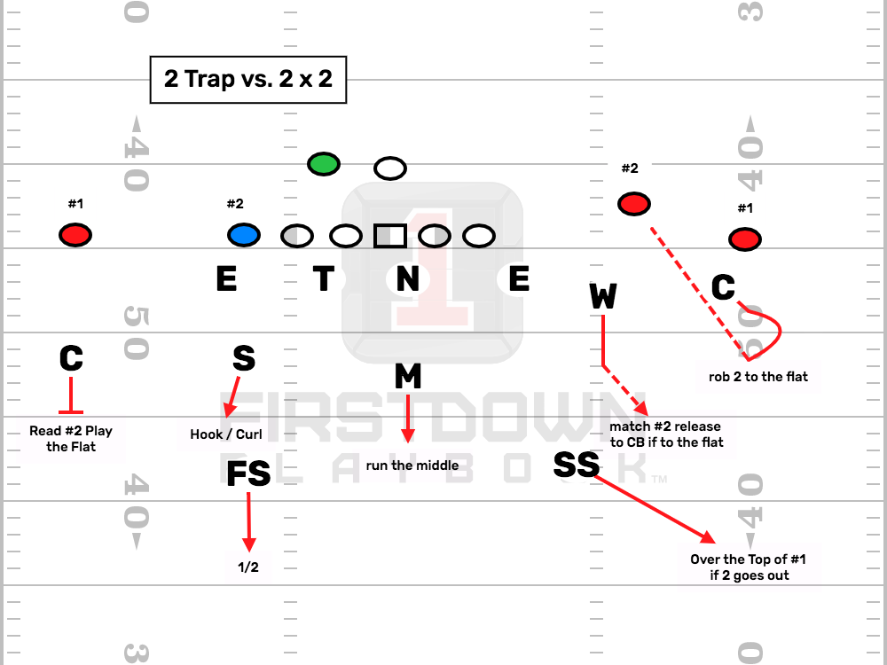 Post Views: 2,278 There are several articles in this member’s area about Cover 2. It was one of my favorite zone coverages to play in as a player and one I liked to call as a coach. Cover 2 has several variations like 2 man and the one I am discussing in this article here, 2 Trap. Cover 2 allows the defense to defend throws into the flat areas while also keeping a pair of safeties over the top for any deep throws that the offense may try. One of the advantages of Cover 2 when it is played right is that it can provide for four defenders deep depending on what routes the offense decides to run at the defense. Sometimes, Cover 2 would provide some windows that a good offense with an accurate quarterback could take advantage of. Some times as a defense you want to take away some of those windows with tighter coverage while also providing the safety of having two defenders deep for long throws. That’s where 2 man came in. In 2 man there are 5 underneath defenders (2 cornerbacks and a combination of either linebackers, nickel and dime backs) providing man coverage on the 5 eligible receivers for the offense. On both hashes there are two deep safeties ready to provide help on long throws. One of the weaknesses of two man sometimes are the throws to the slot wide receivers in the flat. Since 2 man requires the slot defenders to play hard inside leverage, a quick out to the flat can often be a coverage breaker for the offense. So how do you set the offense up for failure when they think they can take advantage of the flat throw? Enter 2 Trap. 2 Trap can be played in a couple of ways. The defense can show a cover 2 look before the snap indicating a zone or show a 2 man look before the snap indicating man coverage. I prefer the latter as I think it encourages the kind of throw that this defense was designed to take away. In a nutshell, 2 Trap gives a two safety high look (safeties on each hash) look to the defense. One one side, the defense will play Cover 2, while on the other side (the trap side), things will be different. See the diagram below Strongside CB: Play Cover 2 rules. Sam Backer: Play Cover 2 rules Strong Safety: Play Cover 2 rules Mike LB: Run the middle Weakside LB: Match route of #2 unless to the flat. If 2 to the flat release to CB and zone off to hook curl area. Weakside CB: Align in 2 man look. Force outside release by #1 and run with him for 5 yards. Then spin head around back inside to see #2 while sitting in the flat. Free Safety: Align in Cover 2 look and buzz to over top of #1 after snap. The execution of the technique by the trap corner is crucial here. His ability to authentically make the coverage look like 2 man is what makes this go. Quarterbacks love to take advantage of the slot defender with the quick out vs. 2 man. The QB will be anticipating making that throw and will often release the ball at the break by the #2 WR. If the cornerback is successful in making it look like he will run up the field with #1, he can walk himself right into an easy interception. As always execution is the key. Keep this in mind if you are a player reading this. If you are coaching reading this, try adding this to your coaching toolbox especially if you are already running a healthy amount of Cover 2 and 2 man. This is the ultimate in bait coverage. Check out these other posts: Coverages Explained | Cover 2 Coverages Explained | 2 Man For questions or comments on this post, send me an email at cwilson@alleyesdbcamp.com – Thank you for being a member. Author Recent Posts alleyesdbcampOwner at All Eyes DB CampChad Wilson is the founder of All Eyes DB Camp and a former standout defensive back for the Miami Hurricanes. After an elite collegiate career, Wilson spent a season with the Seattle Seahawks before transitioning into coaching. A 3-time Florida state champion defensive coordinator, he has spent over 20 years developing the "All Eyes" blueprint that has produced NFL All-Pros and stars like Xavien Howard, Patrick Surtain II, Tyson Campbell, Minkah Fitzpatrick and more. His coaching system is proven at the highest levels—his own sons, Quincy and Marco Wilson, both excelled as starters in the SEC before being drafted into the NFL.Chad is the author of "101 DB Tips"—The Ultimate DB Reference Guide. You can find more information on the manual and how to order your copy in the sidebar and footer of this page. Latest posts by alleyesdbcamp (see all) The Secret to Elite DB Play: Striving for Technique Perfection - March 17, 2026 The Alien Era: How Defensive Backs Can Win vs Athletic Tight Ends - March 4, 2026 These 4 Drills Will Drastically Improve Your Off Man Coverage - February 25, 2026 Related Posts:Coverages Explained: How to Play Cover 4Coverages Explained | 2 InvertCoverages Explained: StubbieCoverages Explained: Cover 2 vs. Doubles in a 3-4 Defense Post navigation 3 Things Great DBs Must Have Dynamic Duos: Troy Vincent & Bobby Taylor