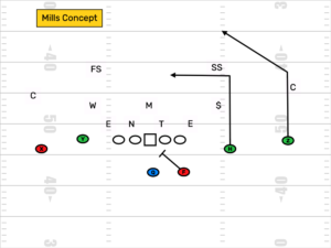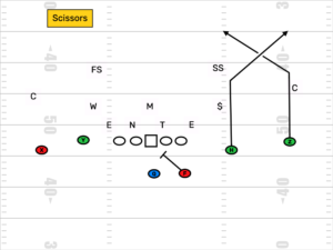 Post Views: 1,612 By popular demand I am getting back to my series on Route Combos you need to know. Having defenders who are keen on how these work really gives them an edge when they are out on the field. The quicker you can spot a route combination, the better a defender’s anticipation would be. Anticipation is the birth of interceptions. In this article I will discuss two Cover 4 / Quarters Coverage beaters. These two route combos are very good at playing tricks on the eyes of the cornerbacks on safeties and opening up space for big plays. Mills Concept and Scissors concept are on deck today. | Mills Concept | Who Runs it Basically any team can run it. This is not solely a spread formation concept. In fact, the coach who invented this concept (or is widely credited with making it popular) Steve Spurrier ran it alot out of I formation. It was typically paired with a draw fake to further wreak havoc on the safeties. This concept can be run out of two back, spread or even empty though it is less effective without at least one back in the backfield. What is it It’s pretty simple as you can see from the diagram above. It is a dig by the inside (#2 receiver) paired with a post route behind it by the outside (#1 receiver). It basically a body blow followed by a right hook to the defense. It is intended to draw in the safety in either Cover 3 or 4 and leave the middle of the field wide open for the post. Speed at the #1 receiver makes this particularly difficult to deal with. Where Do They Run It This route concept is typical from the (-20) your own 20 to the +35 to 40 yard line. It is a big play you see run once teams get to midfield and feel a little more bold in terms of taking risks. However, this concept can get run any time the offense feels they will get the coverage they like (quarters, 4 or 3). When Do They Run It Mills is a nice play to run after sudden change. Right after the opposing team turns the ball over, Mills is a concept offenses like to unleash on the defense to seize the momentum. It’s also, as I mentioned earlier, a nice play to run once the opponent enters midfield or into your territory. It’s a big play waiting to happen. How to Spot It Best way to spot it is by how they line up. Speed at #1 paired with a route runner at #2. The best way to spot it however is by being aware of the situation. After sudden change and team entering midfield area. Also, if your opponent has hit a few dig routes in front of the safety, you can expect this play to come pretty soon thereafter. How to Defend It Obviously, being a more suitable coverage than quarters / cover 4 or cover 3 would be best that is not always likely plus offense always has the luxury of checking to a play if they suspect the coverage they want is coming. It is best to be sound in your coverage rules and execution. Corners be ready to get over the top of 7, 8 and 9 routes. Don’t be overly concerned with deep outs and comebacks. Safeties who are keen enough to recognize the play potentially coming, communicate with the cornerback to alert him that you might have to take the dig and that he will be on his own on the post. | Scissors | Who Runs It This route combo is typically run by spread teams though it can be run out of any Twins formation pairing two receivers to one side. This combo is at it’s best though when the offense spreads the defense out and occupies defenders away from the combo with other routes. What is It This combo pairs a ‘7’ route (corner) by the inside guy (#2 receiver) with a ‘8’ route (post) by the outside receiver. It typically occurs with the corner route being run underneath the post but can be done with the post being run underneath the corner. Where Do they Run It This route combo needs space to be effective so it is typically run in the middle of the field (35 yard line to 35 yard line). Like the Mills Concept it is a big play that is great to run after sudden change or a big play by the offense. In these situations, the defense is likely to be frazzled, possibly confused and prime for confusion vs. this concept. When Do they Run It This is not a play to go get a first down with so unless it’s 3rd and long, you are not likely to see it on 3rd down. It is a good 1st and 10 play after a turnover or when a team enters midfield. It’s also good on “waste downs” when the offense is facing a 2nd and 4 or less where they can take a shot and if they fail, they still have a reasonable 3rd down situation that they can convert. Why Do They Run it Offenses run this because it is a big play waiting to happen. First of all, it is pairing two deep routes together. Second, it has the ability to confuse the secondary and get a man wide open. For example, if the offense has had success running the Mills Concept on the defense. The cornerback is likely to become very concerned about the post route. Vs. the scissors concept, he may take off with the post route. The safety may turn the corner route loose based on the rules of the team’s quarters coverage. This could lead to both players being on the post route. The same could happen with the corner route thus leaving the post route open. How to Spot It First of all, being aware of when this team likes to run this concept based on film study really helps. Furthermore, close splits between the #1 and #2 receiver especially into the boundary can be an indicator. On occasion, the #2 receiver being on the ball could give away this play. Finally, be aware of the in game situation. Is it sudden change? What could happen after the offense has a big run? Where are we on the field, is it time for the offense to take a shot? How to Defend It Communication is key. Safety and cornerback have to be on the same page. Both should know whether they are going to zone it vs. this concept which means the cornerback stays outside and the safety stays inside or ‘lock it’ meaning the safety will take the #2 receiver everywhere he goes after he passes 